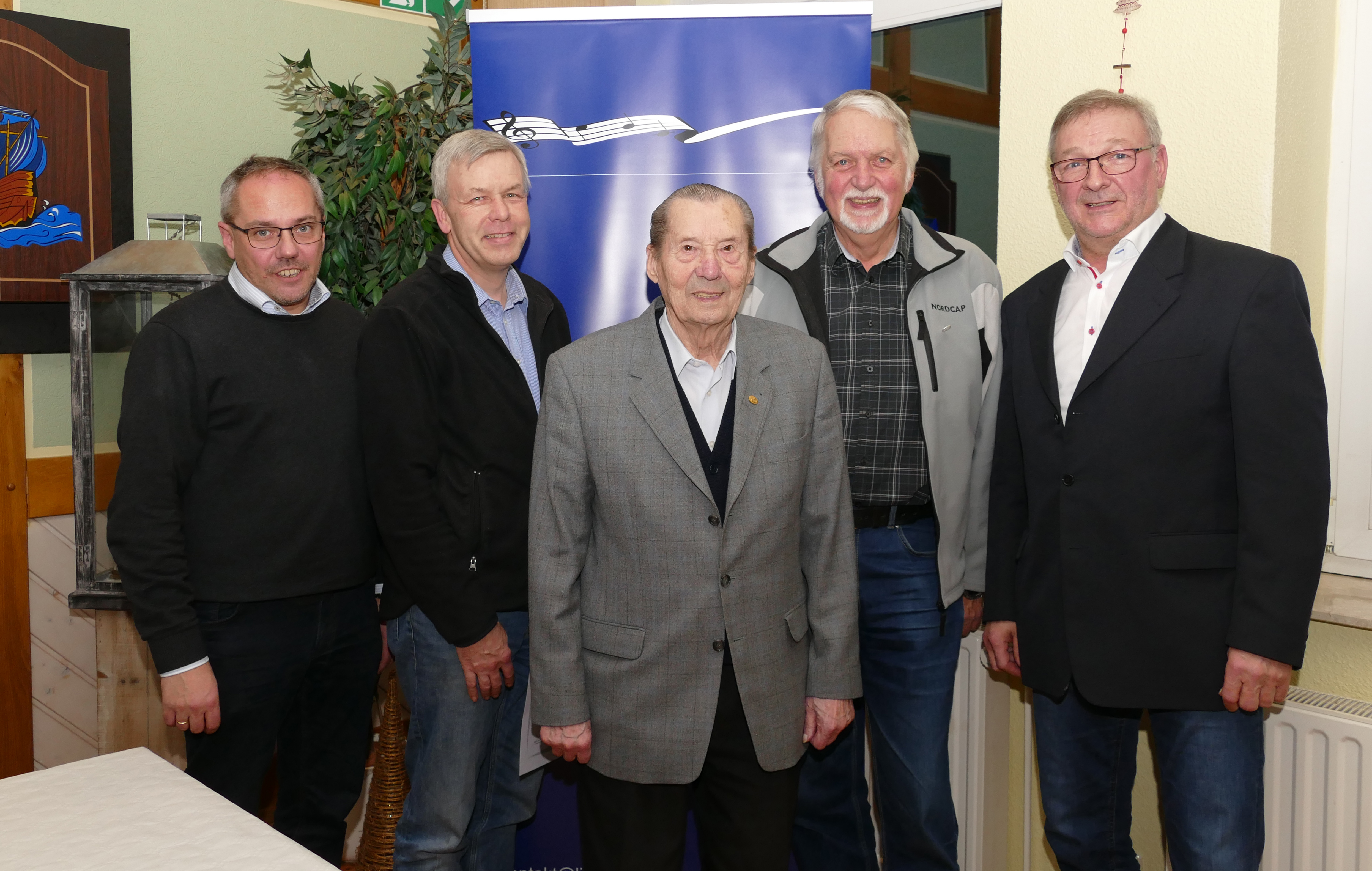 Dazu begrüßte er im Vereinsheim Enzen die aktiven Sänger, unter ihnen auch als „dienstältestes“ aktives Mitglied Wilhelm Sölter, der im vergangenen Jahr auf seine 70jährige Mitgliedschaft im Chor zurückblicken konnte. Außerdem nahm eine große Gruppe von passiven Mitgliedern an der Versammlung teil. In seinem Bericht erinnerte der Vorsitzende an diverse Auftritte und Konzerte in der näheren und weiteren Umgebung Stadthagens und an das vom Chor selbst veranstaltete Herbstkonzert in der Aula des Stadthäger Ratsgymnasiums. Das Konzept, das Weihnachtskonzert in der Kirche in Seggebruch unter das Motto „Schaumburger Weihnacht“ zu stellen und in der Meerbecker Kirche ein eher traditionelles Weihnachtskonzert zu veranstalten, hat sich bewährt und soll auch im kommenden Jahr fortgesetzt werden. Bei der „Schaumburger Weihnacht“ nutzen Schaumburger Künstler die Gelegenheit, gemeinsam mit den Chorsängern auf der Bühne zu stehen. Alle Konzerte, zu denen wie in jedem Jahr wieder einige Solisten und das Blasorchester „Bückeburger Jäger“ eingeladen worden waren, standen unter der bewährten musikalischen Leitung von Chorleiter Manfred Neumann und fanden ein begeistertes Interesse der zahlreichen Zuhörer. Der Vorsitzende berichtete weiter, dass die Zahl der ca. 60 aktiven Sänger konstant gehalten werden konnte. Einige aktive Sänger konnten neu im Chor aufgenommen werden. Für eine 25jährige Mitgliedschaft wurde als aktiver Sänger Kurt Brackhage, als passives Mitglied Jürgen Wehling geehrt. ![]() Unsere Jubilare mit Manfred Neumann und Hartmut Winkelhake (Quelle: Schaumburger Nachrichten) Mit dem „Alfred - Gaertner - Pokal“ wird alljährlich die Stimmlage des Chores mit der höchsten Teilnehmerzahl an Chorproben und Auftritten ausgezeichnet. In diesem Jahr fiel die Ehrung auf den 2. Tenor. Deren Stimmführer Siegmar Schmidt nahm den Pokal vom Vorsitzenden unter großem Applaus der Anwesenden entgegen. Für ihre häufige Teilnahme an Chorproben und Auftritten wurden Fritz Führing, Claus Schendler, Günter Mogwitz und Frank Bär mit einer Mettwurst belohnt. Bei den Vorstandswahlen gab es neben Wiederwahlen nur für eine Funktion eine Veränderung. Die Versammlungsteilnehmer wählten Ernst-Wilhelm Coith zum 1. Schriftführer, der die Funktion vom langjährigen Schriftführer Helmut Wehling übernimmt. Somit setzt sich der Vorstand des Chores zusammen aus