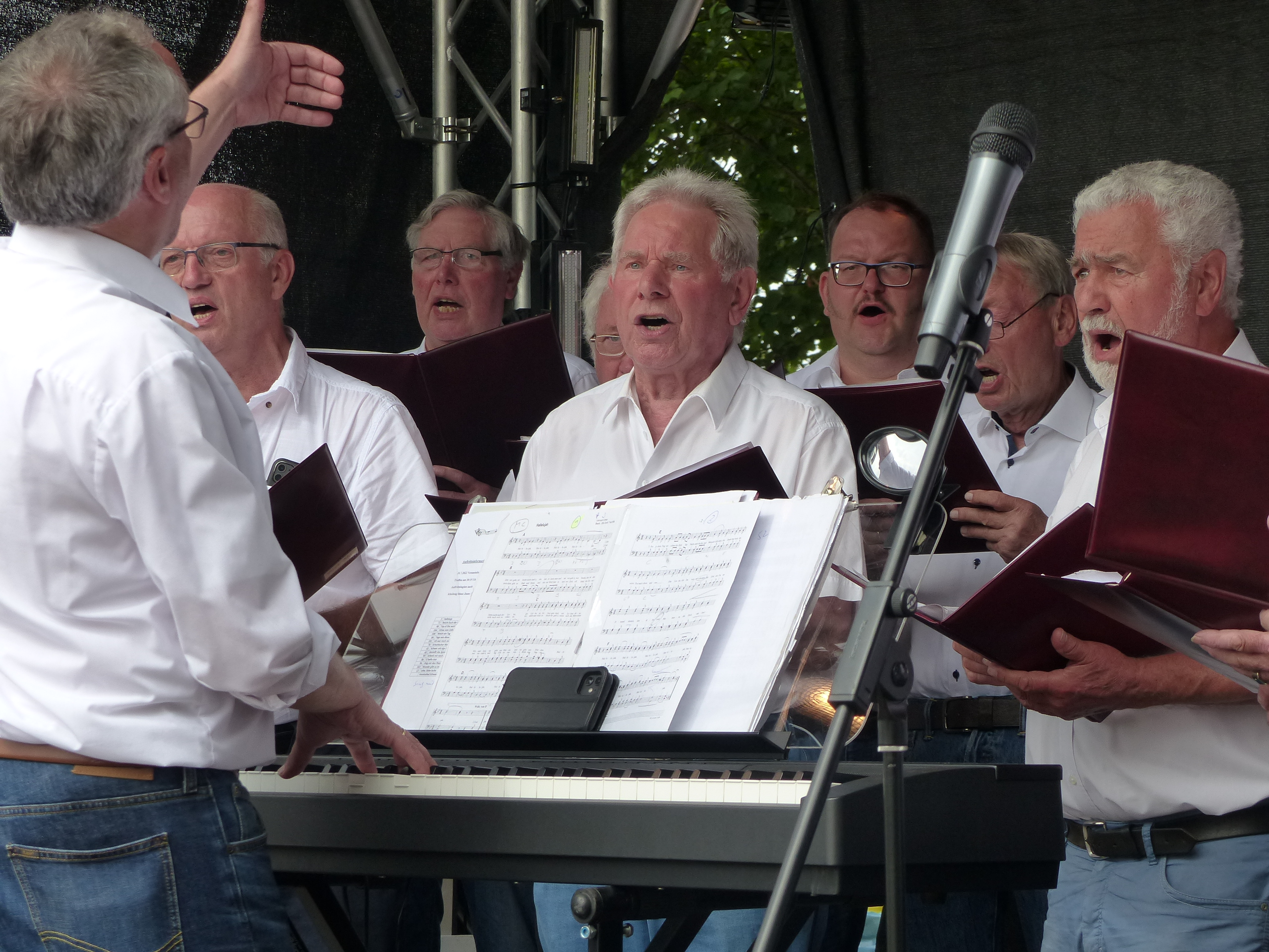Nach einem Konzert verschiedener Rockbands am Samstagabend hatte der Verein am Sonntagmorgen seine Mitglieder und Gäste sowie unseren Chor auf das Sportplatzgelände eingeladen. In diesem Rahmen wurden einige Mitglieder für ihre jahrzehntelange Mitgliedschaft geehrt. Auch unser Sangesbruder Günter Lube konnte seine Auszeichnung für 60 Jahre Mitgliedschaft im Sportverein entgegennehmen. Der "Liederkranz" untermalte mit einigen Liedbeiträgen die Feier, was mit herzlichem Applaus von den Gästen honoriert wurde. Abschließend hatte der Chor noch etwas Besonders "auf Lager": Extra für das Jubiläum hatte der Chor das Vereinslied des Sportvereins eingeübt, das als Zugabe verstärkt durch die Aktiven von SW Enzen vorgetragen wurde. ![]()