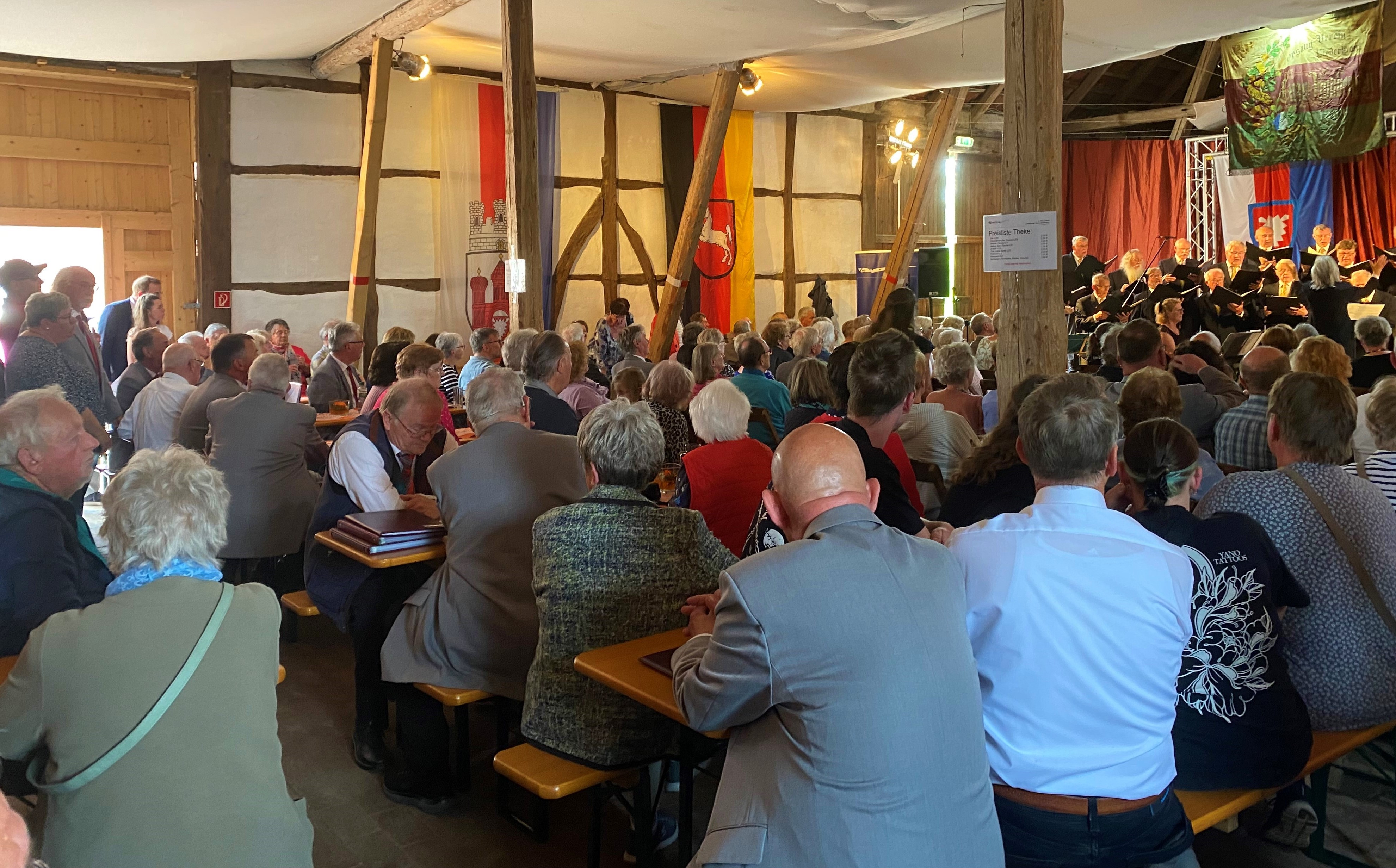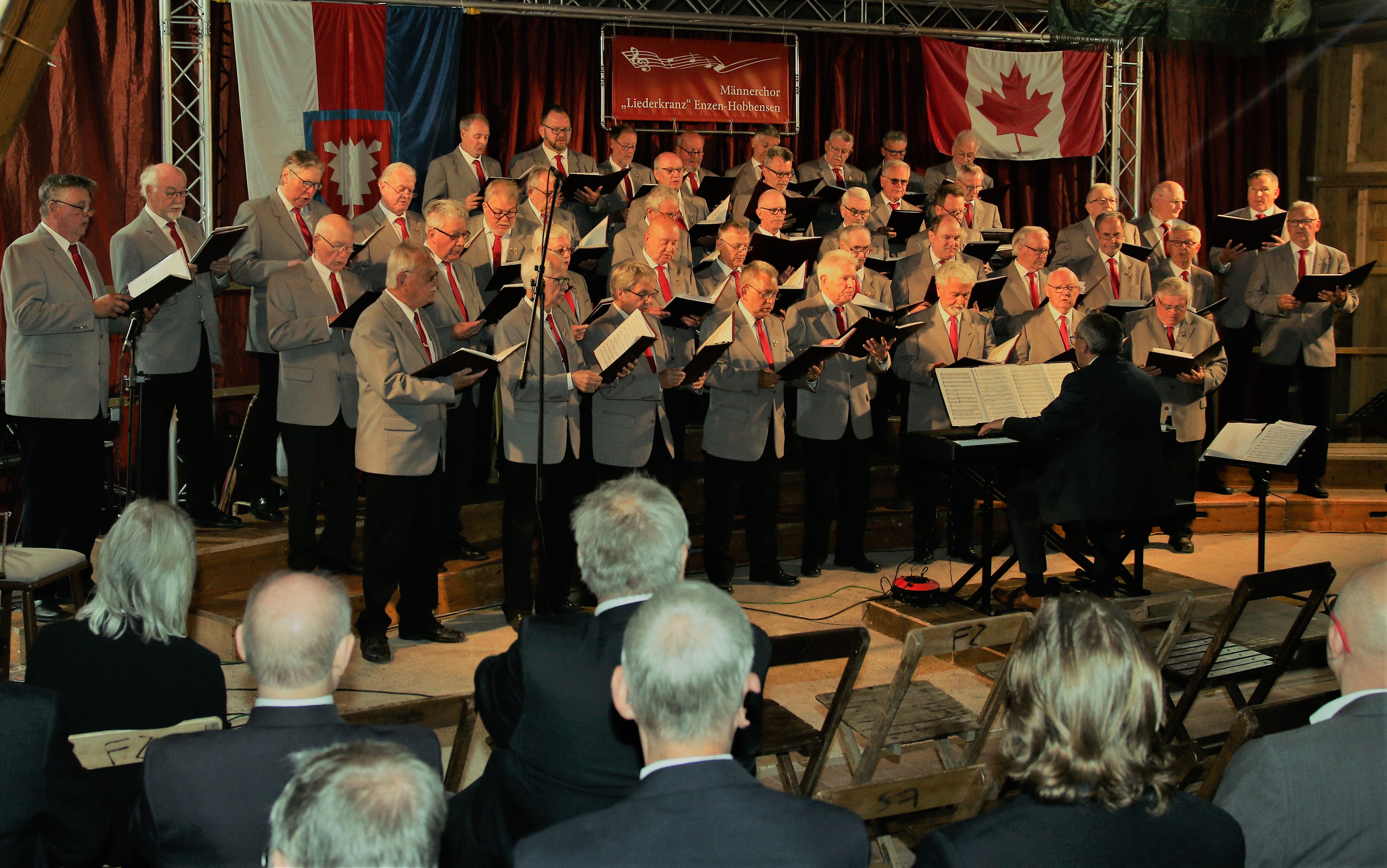 so titelte die heimische Presse ihren Bericht vom Chor- und Musikfestival, zu dem der Männerchor "Liederkranz" Enzen-Hobbensen anlässlich seines 125jährigen Chorjubiläums auf dem Hof Ahnefeld in Obernwöhren eingeladen hatte. Hunderte von Zuhörern haben das herrliche Frühsommerwetter für einen Besuch ausgenutzt und sind teilweise mit Fahrrädern auch aus weiterer Entfernung angereist. Bürgermeister Oliver Theiß und die Landtagsabgeordneten Jan-Philipp Beck und Colette Thiemann richteten mit ihren Grußworten ihren Dank und ihre Anerkennung an den Jubiläumschor. Das mehrstündige bunte Musikprogramm wurde im Wechsel gestaltet vom Gemischten Chor Bad Eilsen, den Vereinigten Chören Rinteln, dem Männerchor Nienbrügge, dem Schütte-Chor aus Bückeburg, Rhythm & Joy aus Stadthagen, dem "Schreyhälse"-Quintett aus Barsinghausen, dem Acapella-Chor Sülbeck, dem Lauenhäger Posaunenchor und Sandra Roth (Saxophon) als Solistin. Neben dem Männerchor "Liederkranz" trat auch der "German-Canadian Male Chorus of Calgary" mehrfach auf und erntete für seine auch in deutscher Sprache vorgetragenen Musikstücke frenetischen Applaus. Besonders eng wurde es auf der Bühne, wenn beide Chöre gemeinsam auftraten, um mit über 70 Sängern Lieder vorzutragen, die jeder Chor für sich separat eingeübt hatte, die jetzt hier beim Besuch der Kanadier erstmals und ohne vorherige Probe gemeinsam vorgetragen wurden. Der Vorsitzende Hartmut Winkelhake zeigte sich in seiner Begrüßung erfreut über die große Besucherzahl. "Die Gründerväter unseres Chores wären sicher stolz auf den positiven Verlauf der langen Chorgeschichte gewesen, der Kriege und auch die Pandemie erfolgreich überdauert hat." Er wies dabei auf einen "Zeitzeugen" aus der Gründerzeit hin, eine Fahne aus dem Jahre 1904, die beim heutigen Jubiläum bestaunt werden konnte. In einer extra für das Jubiläum erstellten Festschrift wird auf die wichtigsten Ereignisse des Chorlebens hingewiesen, die von vielen Konzertreisen ins In- und Ausland u. a. nach Frankreich und Kanada berichtet, die besonderen Konzerte mit namhaften Künstlern, bis hin zu den stets gut besuchten schon traditionellen Herbst- und Weihnachtskonzerten des Chores. Chorleiter Manfred Neumann konnte mit Otto Groll einen besonderen Ehrengast begrüßen, der über viele Jahrzehnte selbst mehrere Chöre geleitet hat und hunderte von Musiktitel für den Chorgesang komponiert oder arrangiert hat und dadurch auch weit über die deutschen Grenzen hinaus bei den Chören ein hohes Ansehen genießt. ![]() Für das leibliche Wohl der Gäste standen neben einem Imbissstand eine Cafeteria bereit, die von den Sängerfrauen geschmackvoll eingerichtet worden war. So bot der Hof Ahnefeld mit seinem historischen Scheunengebäude einen würdigen Rahmen für das Jubiläumsfest des "Liederkranzes", das allen Akteuren und Besuchern noch lange in guter Erinnerung bleiben wird.