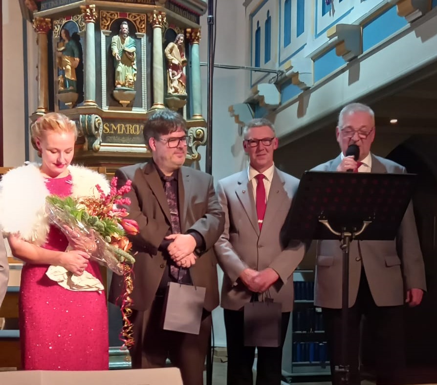 Am 2. Adventsonntag führte der Chor unter dem Motto "Schaumburger Weihnacht" gemeinsam mit der sowohl einfühlsamen wie, auch kraftvollen Stimme der Auetaler Sängerin Biggie Gerstenberg und dem virtuosen Trompeter Christian Wöbking in der Kirche zu Seggebruch ein abwechslungsreiches Programm weihnachtlicher Musikstücke aus unterschiedlichen Epochen auf, das von Chorleiter Manfred Neumann zusammengestellt worden war. Dabei waren sowohl besinnliche Stücke wie das viele Jahrhunderte alte "Dona nobis pacem" als auch Spirituals und Gesänge aus der heutigen Zeit wie "Oh happy day" und "What a mighty day" zu hören. Zum Abschluss trug Nike Heiber die Weihnachtsgeschichte vor. Bei der "Festlichen Weihnacht" am Samstag vor dem 3. Advent hatte der Chor in der Kirche zu Meerbeck die Sopranistin Franziska Abram zu Gast. Leider musste das Bläserquintett "MagentaBrass" aus Krankheitsgründen seinen Auftritt absagen. In dankenswerter Weise stellte sich Christian Wöbking kurzfristig wiederum als Solist zur Verfügung, der mit seinen beiden Instrumenten das Publikum durch seine filigrane Darbietung einiger klassischer Trompetenstücke begeisterte. Franziska Abram füllte mit ihrer wohltönenden lyrischen Sopranstimme akustisch den Kirchenraum und beeindruckte mit ihrem Vortrag einiger klassischer Weihnachtsgesänge schnell das Publikum. Besonders die gemeinsam vom Männerchor und der Solistin vorgetragenen Stücke wie "Mach auf dein Herz zur Weihnachtszeit", "Alle Kinder brauchen Liebe" oder "Oh heilige Nacht" wurden mit lang anhaltendem Applaus honoriert. "Der kleine Trommelmann" wurde vom Chormitglied Michael Gnas an der kleinen Trommel, dem Trompeter Christian Wöbking und dem "Liederkranz" dargeboten und rundete so mit der Klavierbegleitung durch Chorleiter Manfred Neumann das festliche Programm ab. ![]() Mit dem vom Männerchor "Liederkranz" und allen Interpreten vorgetragenen "Stille Nacht" und dem gemeinsam mit den Zuhörern intonierten "Oh du fröhliche" wurden die Konzerte beschlossen und das Publikum in die letzten Tage vor dem Weihnachtsfest verabschiedet. Der "Liederkranz" – Vorsitzende Hartmut Winkelhake überreichte den Solisten und dem Chorleiter ein kleines Präsent und bedankte sich bei den Förderern und Sponsoren des Chores für deren Unterstützung. ![]()