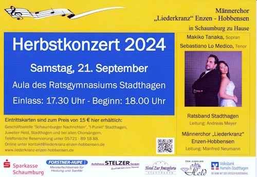 ![]() Ihr könnt Euch auf ein vielseitiges und unterhaltsames Programm freuen. Mit dabei ist in diesem Jahr die „Ratsband Stadthagen“, die seit bereits 1995 von Andreas Meyer als sinfonisches Blasorchester des Ratsgymnasiums Stadthagen geleitet wird. In dem Vierteljahrhundert wurden mehr als 12 Musicals aufgeführt, 23 Schaumburger und 10 Niedersächsische Big Band Meetings u.a. mit der NDR Big Band organisiert, mehr als 40 besondere Konzerte in unterschiedlichsten Kirchen gegeben, acht CDs eingespielt, 20 Bläserklassen an der Schule eingerichtet und auf allen fünf Kontinenten musiziert. Als Sopranistin konnten wir Makiko Tanaka gewinnen, die in Yokohama, Japan geboren wurde. Sie studierte Gesang und Klavier an der Musikhochschule Kunitachi in Tokyo und von 2009 bis 2014 an der Musikhochschule Münster. Des Weiteren hat der in Messina (Italien) geborene Tenor Sebastiano Lo Medico seine Zusage zu unserem Konzert in Stadthagen gegeben. Er studierte zunächst in Sizilien und anschließend an der Musikhochschule Münster Gesang. Beide Solisten werden mit beliebten Solowerken und auch mit zahlreichen Duetten das Publikum begeistern. ![]() Und natürlich wird unser Männerchor „Liederkranz“ Enzen-Hobbensen unter der Leitung von Manfred Neumann mit zahlreichen musikalischen Beiträgen vertreten sein und den musikalischen Hochgenuss in gewohnter Weise abrunden. ![]() Das diesjährige Herbstkonzert beginnt am 21. September um 18 Uhr (Einlass ab 17:30 Uhr) Eintrittskarten sind im Vorverkauf zum Preis von 15 € hier erhältlich: „Juwelier Held“ Stadthagen, „I-Punkt“ Stadthagen, sowie in der Geschäftsstelle der „Schaumburger Nachrichten“. Telefonische Bestellungen sind möglich unter 05721/891888 oder via Mail an kontakt@liederkranz-enzen-hobbensen.de Auf unser Wiedersehen freuen wir uns sehr, bis dahin wünschen wir Euch eine gute und gesunde Zeit. Herzliche Grüße vom Männerchor "Liederkranz" Enzen-Hobbensen … in Schaumburg zu Hause