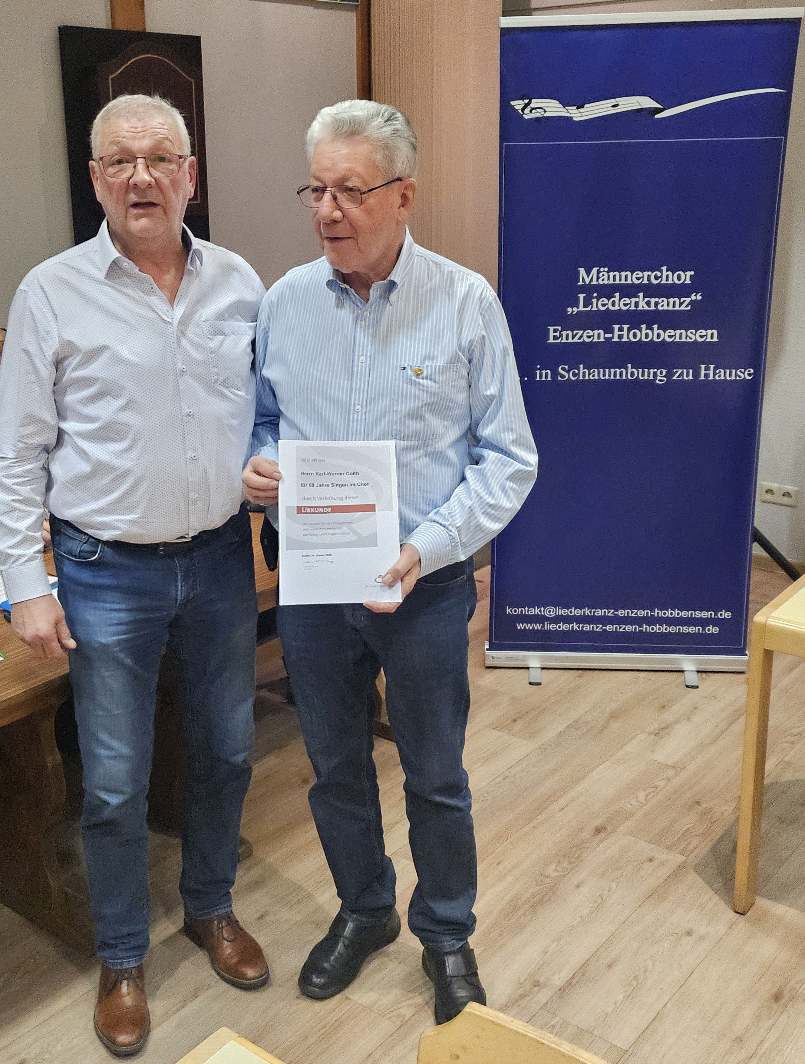 Besondere Höhepunkte waren auf Einladung von Fördermitglied Jan-Philipp Beck (MdL) der Besuch im Niedersächsischen Landtag in Hannover, das Herbstkonzert in der Aula des Ratsgymnasiums Stadthagen, sowie die traditionellen Weihnachtskonzerte in den Kirchen in Seggebruch und Meerbeck. ![]() Für seine 25-jährige Zugehörigkeit im „Liederkranz“ wurde Udo Möller geehrt, Karl-Werner Coith erhielt für 60 Jahre Chorsingen eine Auszeichnung vom „Deutschen Chorverband“. Der „Alfred-Gaertner-Pokal“, eine Anerkennung für die aktivste Stimme bei Auftritten und Proben im Vorjahr, ging an die Sänger vom 2. Tenor. ![]() Bei den Neuwahlen des Vorstandes wurde der bisherige 2. Vorsitzende Frank Bär einstimmig zum neuen ersten Vorsitzenden des Männerchores gewählt. Die weiteren Ergebnisse: Klaus-Dieter Heisinger (2. Vorsitzender), Martin Rehmer (1. Kassierer), Kurt Druschke (2. Kassierer), Stefan Mogwitz (1. Schriftführer), Michael Walter (2. Schriftführer), Michael Gnas (1. Notenwart) und Günter Mogwitz (2. Notenwart). ![]() Mit viel Applaus dankten die Versammlungsteilnehmer Hartmut Winkelhake (bisheriger 1. Vorsitzender) und Ernst-Wilhelm Coith (bisheriger 1. Schriftführer) für Ihren besonderen Einsatz in der Vorstandsarbeit; beide hatten sich auf eigenen Wunsch nicht mehr zur Wahl gestellt. In seinem Jahresrückblick dankte Chorleiter Manfred Neumann allen Sängern, Fördermitgliedern, Helfern und Sponsoren für ihr großes Engagement und die geleistete Unterstützung. Sein positives Fazit auf die Hauptkonzerte und weitere Auftritte im Jahr 2024 rundete er ab mit der Schilderung von dem guten Verlauf bei den digitalen Entwicklungen des Männerchores. Für das neue Vereinsjahr gibt es bereits einige feste Planungen für Auftritte und die eigenen Konzerte. Die positiven Resonanzen von Mitgliedern und Konzertbesuchern motivieren zudem, den erfolgreichen Weg des Chores mit Mut und immer neuen Ideen weiter zu gestalten. ![]()