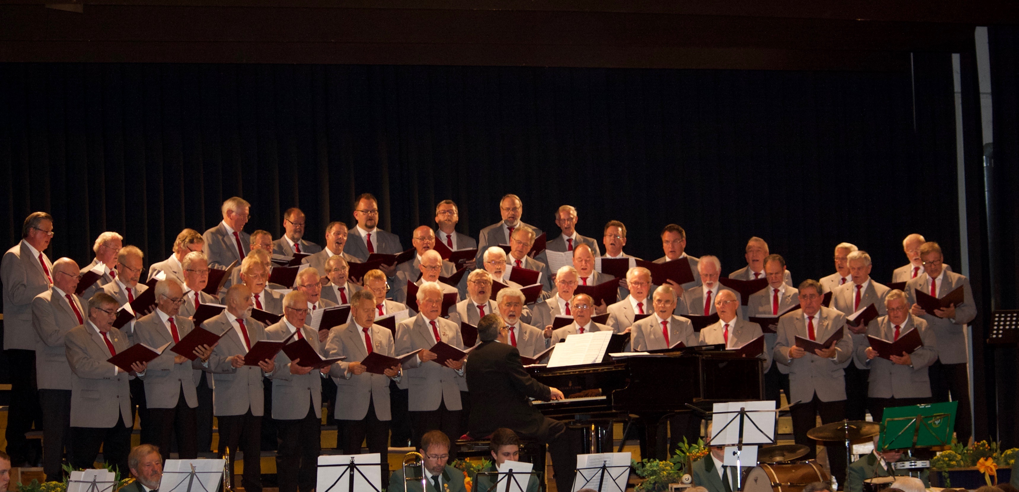 Mit bewährter Unterstützung des „Blasorchester Bückeburger Jäger“ unter der souveränen Leitung von Sven Schnee, dem jungen Tenor Ricardo Marinello sowie dem brillanten Duo Anton Sjarov (Violine) und Wilhelm Grote (Gitarre) hat der Männerchor „Liederkranz“ mit seinen 50 Akteuren die über 500 Zuhörer in der Aula des Ratsgymnasium von Beginn an in den Bann gezogen. Eine abwechslungsreiche und harmonisch auf einander abgestimmte Programmfolge ließ das knapp 3-stündige Konzert wie im Fluge vorbeiziehen. Es scheint nahezu vermessen, aus dem vom Chorleiter Manfred Neumann zusammengestellten Gesamtprogramm einzelne Momente hervorzuheben, da alle Mitwirkenden mit ihren Darbietungen gleichermaßen zu begeistern wussten. Dennoch sollten die Solisten nicht gänzlich unerwähnt bleiben. So hat sich der junge Tenor Ricardo Marinello, der 2007 mit dem Titel „Time to say Goodbye“ als damals 18-jähriger Nobody den Titel der allerersten RTL-Show „Das Supertalent“ geholt und der nach einem intensiven klassischen Gesangstudium in Düsseldorf nun auf vielen großen Bühnen in Deutschland und im benachbarten Ausland gastiert, mit seiner starken, ausdrucksvollen Stimme sofort in die Herzen der Besucher gesungen. Ein weiterer Glücksgriff ist Manfred Neumann mit der Verpflichtung des Duos Anton Sjarov / Wilhelm Grote aus Minden gelungen. Dieses virtuose Zusammenspiel von Violine und Gitarre ließ die Kunst der beiden begnadeten Musiker am Instrument immer wieder aufblitzen und die Töne zu einer wundervollen Einheit verschmelzen. Das Publikum dankte allen Mitwirkenden während und nach dem Konzert mit donnerndem Applaus und stehenden Ovationen für das schöne Herbstkonzert 2017, das noch lange in Erinnerung bleiben wird.
