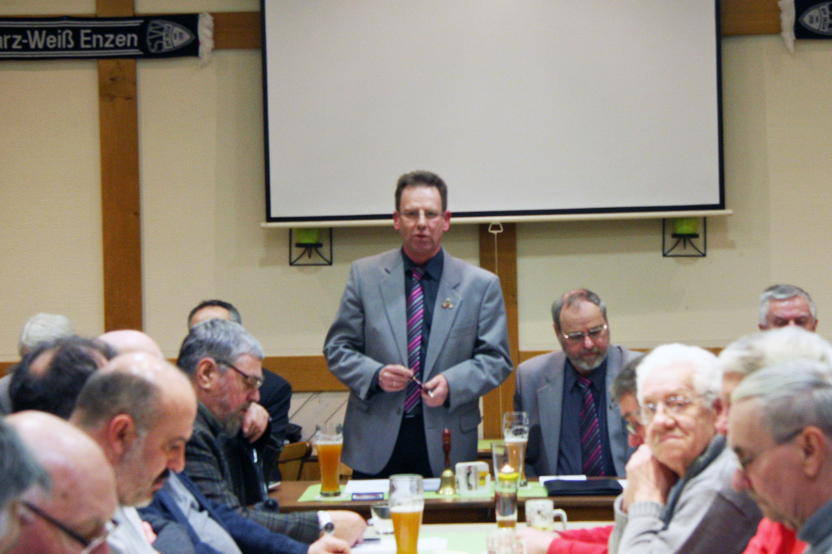 ![]() Der 1. Vorsitzende, Martin Rehmer berichtet über die Aktivitäten im Jahr 2014 Bei der diesjährigen Jahreshauptversammlung des Männerchores "Liederkranz" Enzen-Hobbensen, am 17. Januar 2015 im Vereinsheim in Enzen, konnte eine durchweg sehr positive Grundstimmung der versammelten 65 Mitglieder festgestellt werden. Nach der offiziellen Eröffnung und Begrüßung durch den 1. Vorsitzenden Martin Rehmer, dem Gedenken an die im letzten Jahr verstorbenen Sänger und Fördermitglieder berichtete Martin Rehmer über die vielen privaten und öffentlichen Auftritte des Chores im ersten Halbjahr und den gemütlichen Halbjahresabschluss, vor der Sommerpause, im Vereinsheim. Gleich nach der Sommerpause wurde ein Projekt zur Gewinnung neuer Sänger ins Leben gerufen, was - auch Dank der Presseunterstützung - außerordentlich war. 7 neue Männer und ein Ehemaliger schlossen sich dem Projekt und anschließend dem Chor als Mitglied an. Damit erhöhte sich im Männerchor "Liederkranz" Enzen-Hobbensen die Anzahl auf 61 aktive Sänger und auf 151 Gesamtmitglieder.