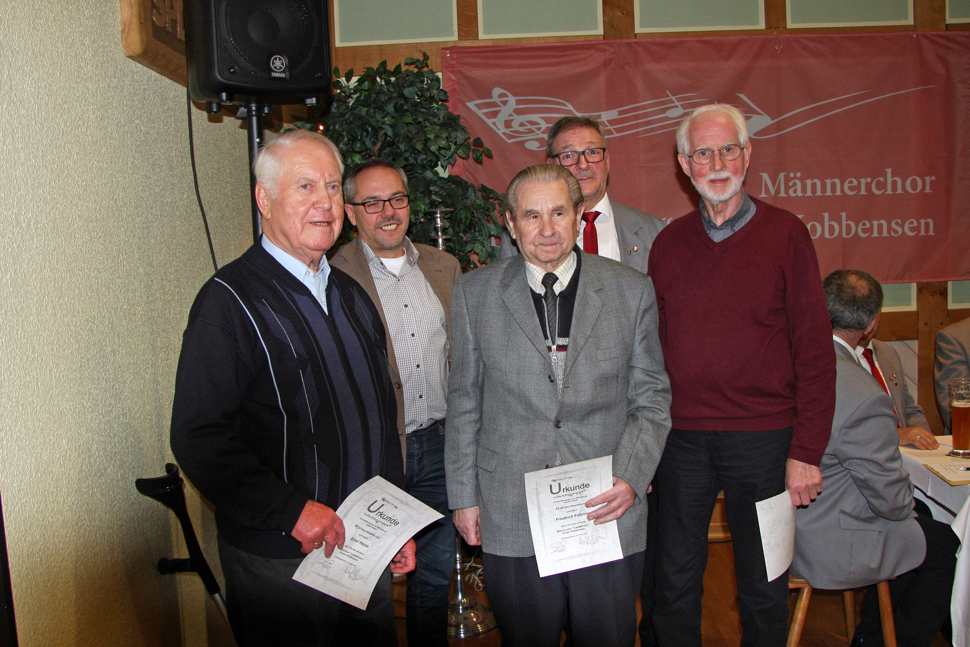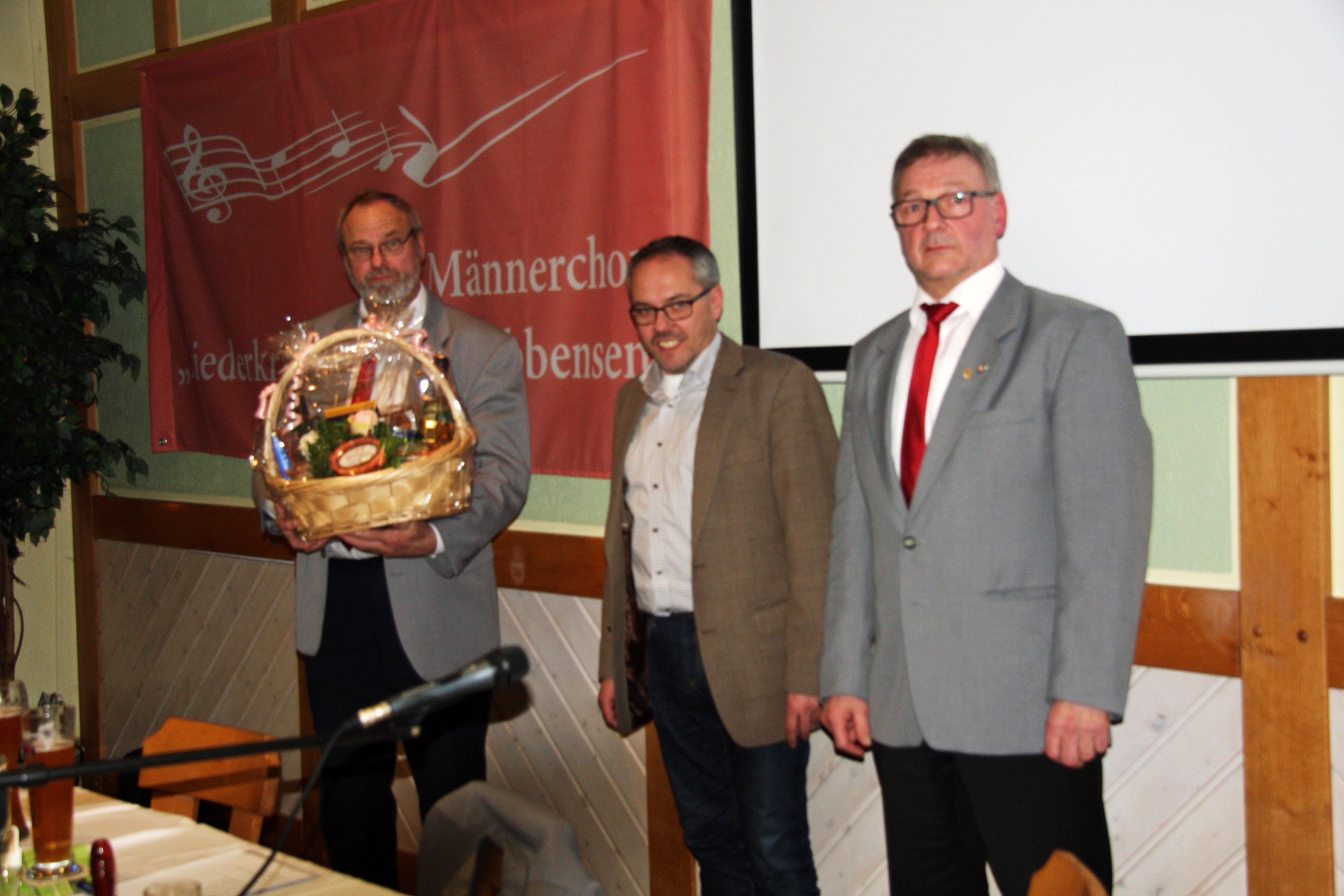 ![]() Ernst Heine, Manfred Neumann, Fritz Führing, Hartmut Winkelhake und Hans-Dieter Stahlhut bei der Ehrung 65 aktive und fördernde Mitglieder des Männerchores „Liederkranz“ EnzenHobbensen waren der Einladung zur Jahres-Hauptversammlung am letzten Samstag gefolgt. Hartmut Winkelhake begrüßte die Teilnehmer und freute sich über die große Resonanz. Zu Beginn gedachten die Anwesenden der Versammlung der im Jahre 2016 verstorbenen Mitglieder mit einer Gedenkminute. Anschließend wurden zahlreiche mit Glieder für ihre langjährige Mitgliedschaft geehrt. Für 25 Jahre: Fritz Führing Für 50 Jahre: Ernst Heine und Hans-Dieter Stahlhut Für die höchste Teilnahmequote an Chorproben und Auftritten wurden Kurt Jeromin (1.Bass) und Helmut Wehling (2.Tenor) mit einer Mettwurst sowie der gesamte 2. Tenor mit dem Alfred-Gärtner-Pokal ausgezeichnet. Die nach dem Jahresbericht des 1. Vorsitzenden anstehenden Neuwahlen des Vorstandes ergaben folgendes Ergebnis: 1. Vorsitzender: Hartmut Winkelhake 2. Vorsitzender: Bernd Stehle 1. Kassierer: Martin Rehmer 2. Kassierer: Kurt Druschke 1. Schriftführer: Helmut Wehling 2. Schriftführer: Michael Walter 1. Notenwart: Claus Schendler 2. Notenwart: Günter Mogwitz Im Anschluß bedankte sich Hartmut Winkelhake beim bisherigen 2. Vorsitzenden Rolf Lohmann, der sich aus persönlichen Gründen nicht mehr zur Wahl gestellt hatte, für die jahrelange herausragende Leistung zum Wohle des „Liederkranz“ Enzen-Hobbensen mit einem Geschenk. Rolf Lohmann wird auch weiterhin den Chor als aktiver Sänger unterstützen. ![]() Scheidender 2. Vorsitzender Rolf Lohmann mit Manfred Neumann und Hartmut Winkelhake Manfred Neumann brachte als Chorleiter die vielen Aktivitäten des Jahres 2016 in Erinnerung und dankte allen aktiven und fördernden Mitgliedern, den Sponsoren für die große Unterstützung und der Presse für die großartige Begleitung. Gleichzeitig bat er auch künftig um gleiches Engagement, um den allgemein schwächelnden Trend der Männerchöre auch weiterhin erfolgreich entgegenwirken zu können. Nach einem herzhaften Essen wurden noch ein paar gemütliche Stunden in fröhlicher Runde verbracht.