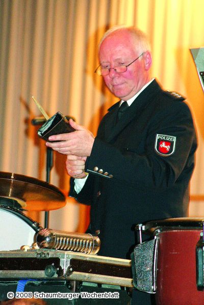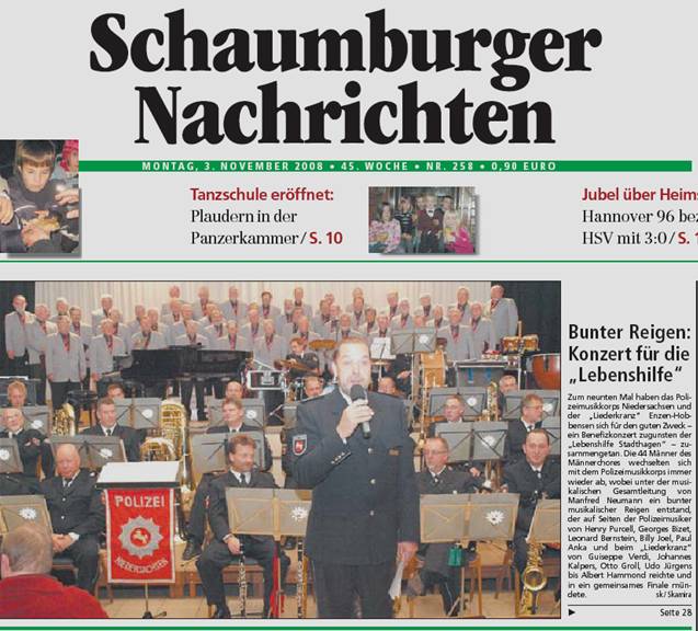 Reinerlös fließt in neuen KindergartenSTADTHAGEN (mr). Rund 350 Zuschauer genossen das Benefizkonzert zu Gunsten der Lebenshilfe, das zum neunten Mal mit dem Polizeimusikkorps Niedersachsen und dem Männerchor "Liederkranz" Enzen-Hobbensen in der Aula des Ratsgymnasiums stattfand. Manfred Sellmann, Geschäftsführer der Lebenshilfe, ist mit der Besucherzahl sehr zufrieden. Schließlich habe es eine Menge an Konkurrenzveranstaltungen am vergangenen Sonnabendabend gegeben. Der Reinerlös fließt in den neuen Kindergarten, der in Bad Nenndorf entstehen soll. Circa 3 000 Euro werden aus Spenden, Eintrittsgeldern und Verkaufserlösen zusammenkommen, rechnete Sellmann vor. Humorvoll führte der Moderator Andreas Läpke, in dem Polizeimusikkorps einer der Posaunenspieler, durch das Programm. Sowohl das Korps als auch der Chor boten seinen Zuhörern ein abwechslungsreiches Repertoire. Das Publikum war begeistert. 2009 werde sowohl für die Veranstaltung als auch für das Polizeimusikkorps ein besonderes Jahr, berichtete Sellmann. Während das Benefizkonzert zum zehnten Mal stattfinden wird, feiert das Polizeimusikkorps Niedersachsen sein 100-jähriges Bestehen. Eine gute Gelegenheit, erneut ein hochkarätiges Konzert auf die Beine zu stellen.
