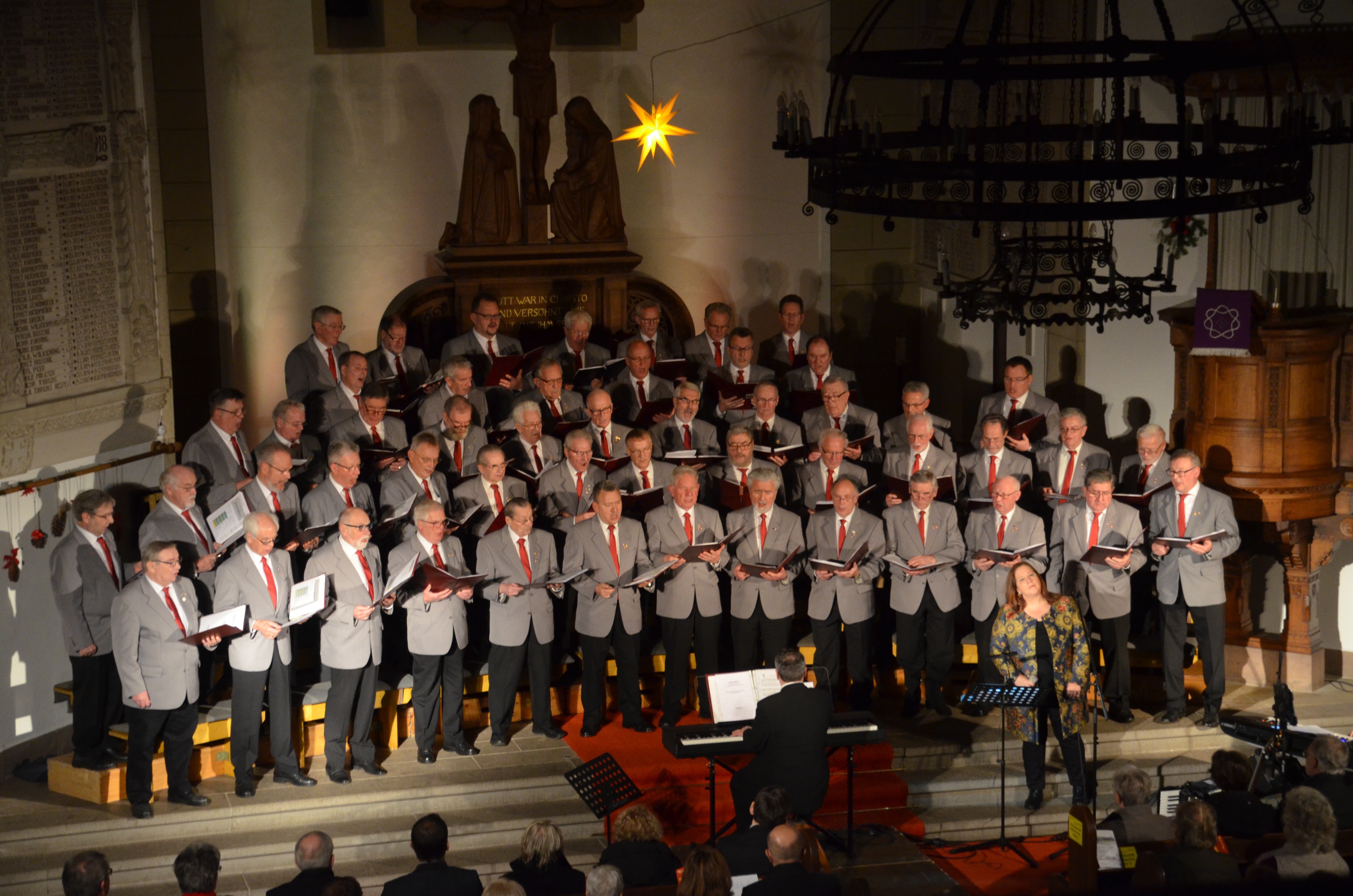 Hans-Angelus Meyer, neuer Pastor in Seggebruch, brachte es in seiner Begrüßung vor ausverkauftem Haus gleich auf den Punkt. „Das Weihnachtskonzert des Männerchores „Liederkranz“ gehört für die Schaumburger Bevölkerung zum festen Bestandteil der Vorbereitung auf das Weihnachtsfest“, betonte der sich selbst ernannte „Neu-Schaumburger“. Mit großem Applaus wurden anschließend die über 50 Männer des „Liederkranz“ und ihr berühmter Konzert-Gast Kathy Kelly begrüßt, die es trotz eines straffen Terminkalenders geschafft hat, das Konzert in eindrucksvoller Weise zu bereichern. Mit „Ich freue mich, nach 4 Jahren wieder hier bei Ihnen sein zu dürfen“ bedankte sich das Mitglied der legendären „Kelly-Family“ beim Männerchor und dem Publikum. Nach der offiziellen Begrüßung durch den Vorsitzenden des „Liederkranz“ Hartmut Winkelhake zeigte der Männerchor mit über 50 Sängern erneut sein hohes Niveau in einem vom Chorleiter Manfred Neumann wunderbar zusammengestellten Programm mit überwiegend bekannten Stücken wie „Fröhliche Weihnacht“, „Oh happy day“, „Glorius Kingdom“, „o heil'ge Nacht“, „Halleluja“ von Leonard Cohen und „Feliz navidad“. Besonders hervorzuheben ist das Solo des Tenors Martin Rehmer aus den eigenen Reihen mit „Jerusalem“ von Stephen Adams und Fritz Ihlau, welches in den 50er Jahren komponiert wurde und mit einem nachdenklichen Liedtext das Jerusalem der Nachkriegszeit und bis heute berührt. Mit großem Applaus bedankten sich die Konzertbesucher bei Martin Rehmer für seinen herausragenden Vortrag. Kathy Kelly bezauberte wie bereits vor 4 Jahren das Publikum mit ihrer ausdrucksvollen leidenschaftlichen Stimme durch einige bekannte Weihnachtskompositionen der Kelly-Family wie „who, II come with me“, „An Angel“, „Take my hand“ sowie mit „Ave Maria“ von Franz Schubert, „Die „Rose“ und gemeinsam mit dem „Liederkranz“ vorgetragenen Weihnachtsliedern. Ein „Fröhliches Weihnachtskonzert“ ging mit dem gemeinsam mit den Konzertbesuchern gesungenen „O du fröhliche“ zu Ende und entließ das Publikum mit einer besonders eindrucksvollen Einstimmung auf das bevorstehende Fest.