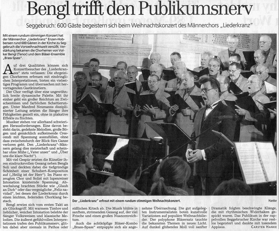 Bengl trifft den Publikumsnerv Mit einem rundum stimmigen Konzert hat der Männerchor „Liederkranz“ Enzen-Hobbensen rund 600 Gästen in der Kirche zu Seggebruch die Vorweihnachtszeit versüßt. Verstärkung bekamen die Chorherren von Volker Bengl (Tenor) und dem Bläser-Ensemble „Brass-Spass“. Auf drei Qualitäten können sich Konzertbesucher des „Liederkranzes“ stets verlassen: Die ehrgeizigen Chorherren erfreuen mit eindringlichen Interpretationen, bieten ein vielseitiges Programm und überraschen mit hervorragenden Gastkünstlern. Der Chor verfügt über eine ungewöhnlich breite dynamische Palette. Mit ihr einher geht ein großer Reichtum an Zwischentönen und farblichen Schattierungen.