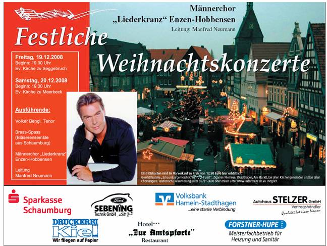 Im Jubiläumsjahr „110 Jahre Liederkranz Enzen-Hobbensen“ sollte dem Publikum auch zu Weihnachten ein besonderes Erlebnis geboten werden. Da unsere Konzertbesucher in der Vergangenheit immer wieder nach einem erneuten Auftritt des Tenors Volker Bengl in Schaumburg fragten, haben wir uns erfolgreich um ein Engagement dieses außergewöhnlichen Sängers bemüht. Die Sympathie beruht jedoch durchaus auf Gegenseitigkeit; Volker Bengl kommt gern nach Schaumburg und wird sein Können sogar bei zwei Konzerten präsentieren :
